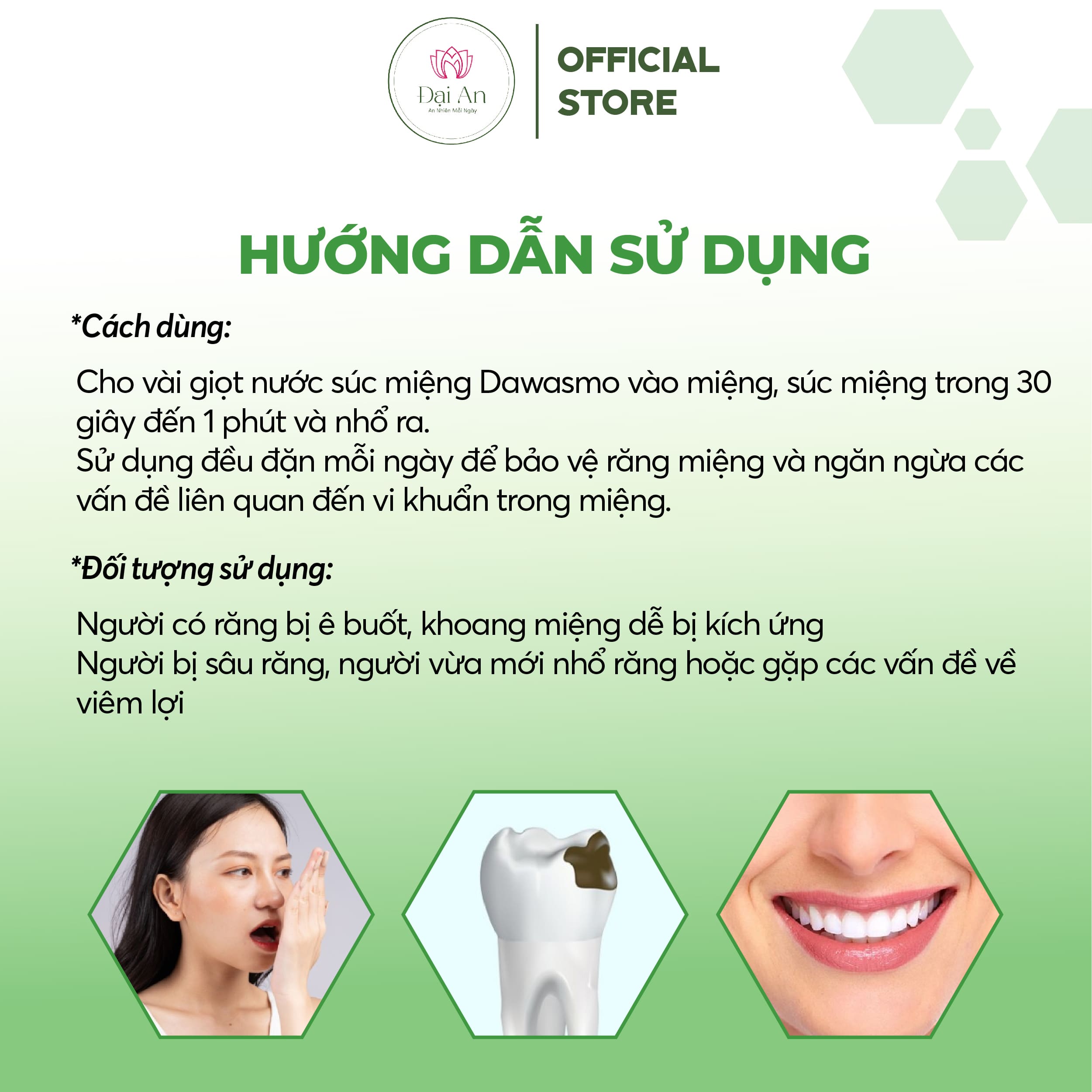 Hãy bắt đầu chăm sóc sức khỏe răng miệng ngay hôm nay với Nước Súc Miệng DAWASMO từ Dược Liệu Đại An, giải pháp thiên nhiên giúp bạn khử mùi hôi miệng và bảo vệ răng miệng hiệu quả!