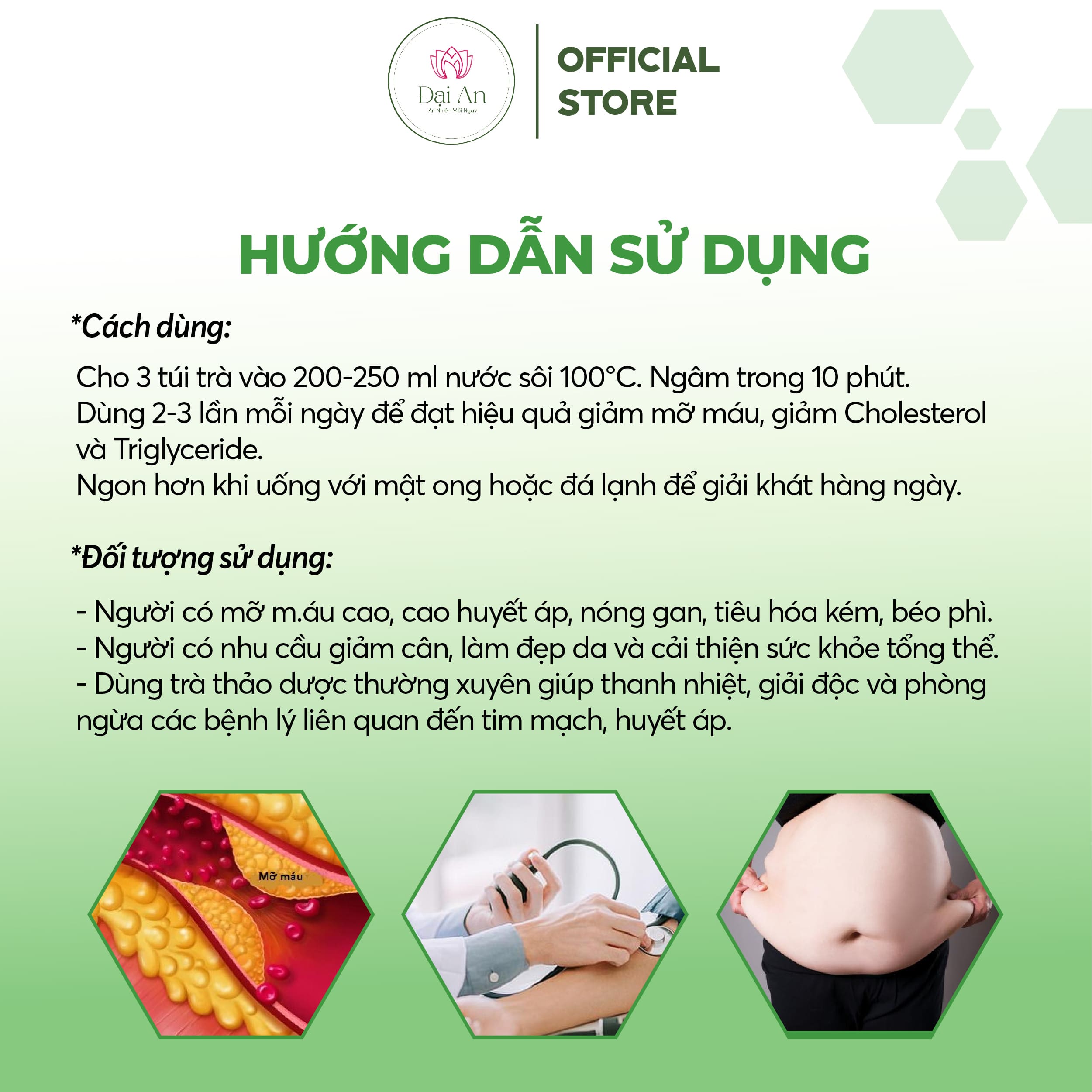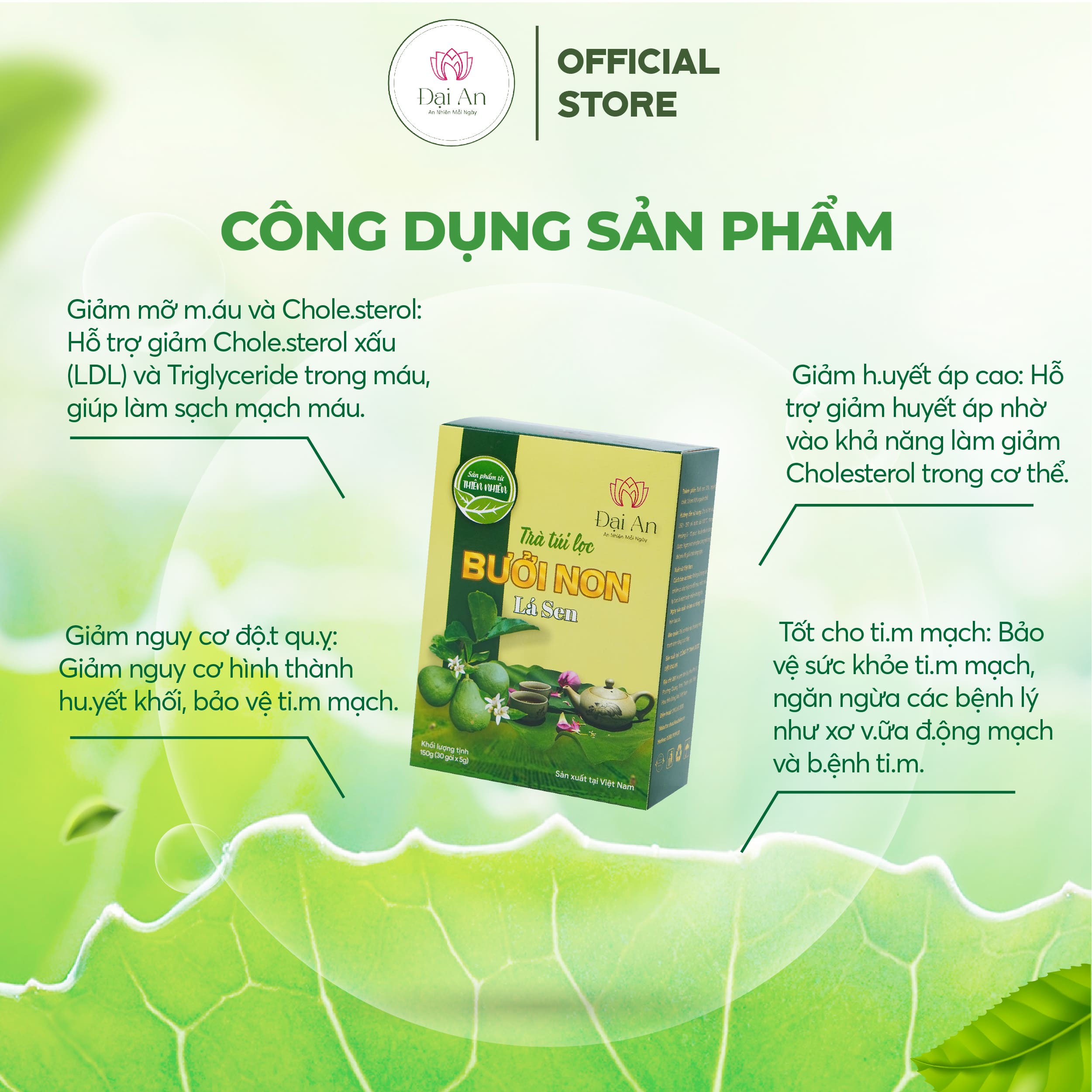 Trà Bưởi Non Lá Sen Túi Lọc (Dạng Gói) – Giải pháp tự nhiên giúp giảm mỡ máu, giảm cholesterol, và hỗ trợ tăng cường sức khỏe tim mạch. Thành phần gồm vỏ bưởi non, phấn linh chi, và lá sen giúp làm giảm nguy cơ đột quỵ do huyết khối, giảm huyết áp cao do cholesterol, và hỗ trợ điều trị rối loạn lipid máu. Trà còn giúp cải thiện tiêu hóa, ngăn ngừa mỡ máu, xơ vữa động mạch và giúp kiểm soát cân nặng hiệu quả.
